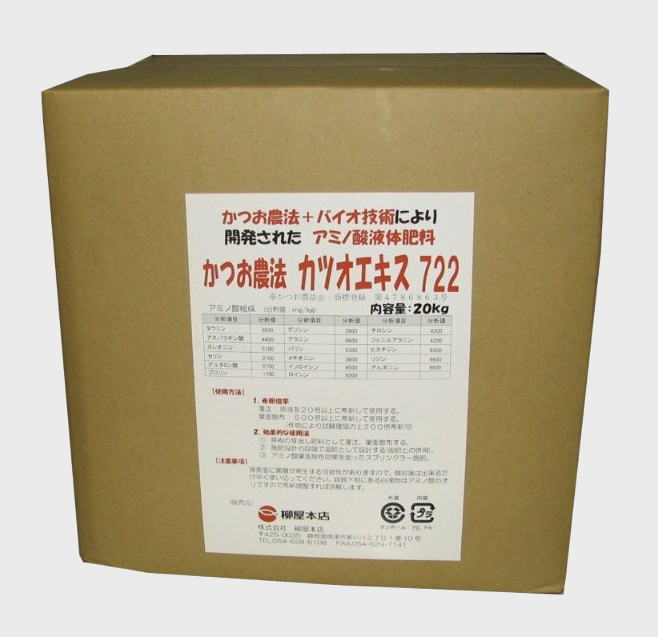 水を一切加えず、新鮮な生かつおが持つ天然酵母によって分解されたかつお肉のエキスが主原料です。窒素の吸収性を考慮し、分解液に硝酸性窒素等早効き成分も加え、更にリン酸源、カリ源を添加しています。